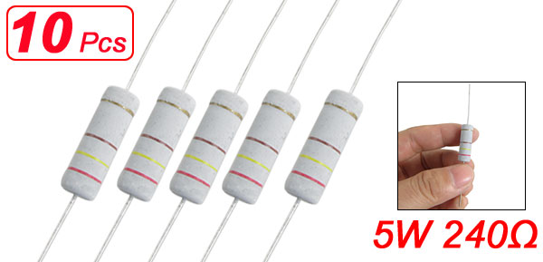Product Name Metal Oxide Film Resistor Features Axial Lead Power Rating 5W Resistance Tolerance ± 5% Withstand Voltage 700V Resistance 240Ω Lead Size (Each End) 29 x 0.7mm / 1.1" x 0.028"(L*D) Body Size 24 x 6mm / 0.9" x 0.2" (L*D) Color As Picture Show Weight 37g Package Content 10 x Metal Film Resistors - Reviews