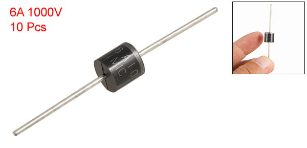 Product Name Rectifier Diodes Model 6A10 Peak Repetitive Reverse Voltage 1000V Max. Forward Current 6A Material Type Silicon Body Size(Approx.) 9.05 x 9mm / 0.356" x 0.354"(L * D) Lead Size (Each End) 27 x 1.27mm / 1.0" x 0.05" (L * D) Total Length (Approx.) 60mm / 2.36" Color As Picture Shown Weight 20g Package Content 10 x Rectifier Diodes - Reviews