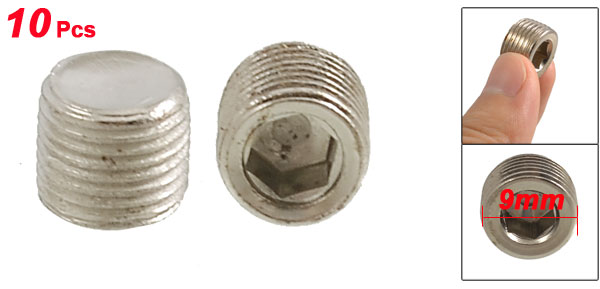Product Name Hex Head Pipe Plug Color Silver Tone Material Metal Thread Diameter 9mm Thread Size 1/8" PT Hex Side to Side Diatance 5mm/ 0.2" High 8mm/ 0.31" Net Weight 31g Package Content 10 x Hex Head Pipe Plug - Reviews