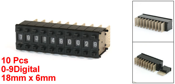 Product Name Pushwheel Switch Model KM2 Number of Unit 1 Digital 0,1,2,3,4,5,6,7,8,9 Code Method Decimal Mounting Size(Each) 18 x 6mm/0.71" x 0.24"(W*T) Each Height 28mm/ 1.1" Total Length 60mm/ 2.4" Color Black, Khaki Material Plastic, Electronic Parts Weight 15g Package Content 10 x Pushwheel Switches - Reviews