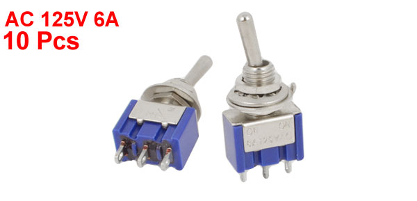 Details10 x Blue AC125V 6A 3 Positions ON-Off-ON SPDT Toggle Switch  Product Name Toggle Switch Rating AC 125V 6A Pin Number 3 Pins Position 3(On/Off/On) Type SPDT Screw Diameter 5.7mm / 0.224" Total Size(Approx.) 3.3 x 1.3 x 0.8cm / 1.3" x 0.5" x 0.3"(L*W*T) Weight 50g Package Content 10 x Toggle Switch
