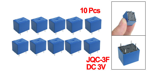 Product Name General Purpose Relay Model JQC-3F Coil Voltage DC 3V Contact AC 240V/7A 125V/10A DC 28V/10A 10A/28V Pin Quantity 5 Pin Size (Approx.) 1.8 x 1.4 x 1.9cm / 0.7" x 0.6" x 0.7"(L*W*T) Color Blue Weight 93g Package Content 10 x General Purpose Relay - Reviews