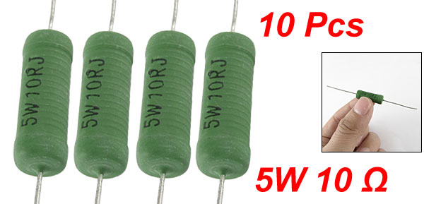 Product Name Wire Wound Resistor Type Fixed Type Rated Power 5W Resistance 10 Ω Resistance Tolerance ±5% (J) Material Metal, Ceramic Pin Diameter 0.7mm/ 0.028" Pin Length 29mm/ 1.1" (Each End) Body Size 7 x 24mm/ 0.28" x 0.94" (D*L) Total Length 83mm/ 3.3" Color Green Weight 30g Package Content 10 x Wire Wound Resistors - Reviews