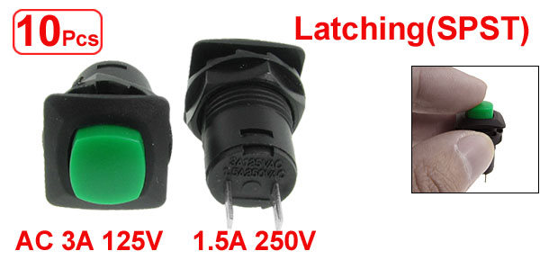 Product Name SPST Push Button Switch Action Type Latching Contact Type NO Rating Voltage AC 3A / 125V; 1.5A / 250V Terminals Quanlity 2 Pins Mounting Hole Diameter 12.3mm / 0.48" Button Size 9 x 9mm / 0.35" x 0.35"(L * W) Terminals Pitch 5.9mm / 0.232" Overall Size 15.2 x 15.2 x 30.2mm / 0.60" x 0.60" x 1.19"(L*W*H) Material Plastic & Metal Color Green & Black Weight 31g Package Content 10 x SPST Push Button Switch - Reviews
