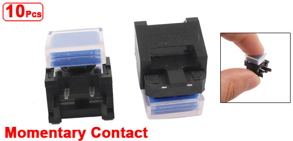 Product Name Tact Switch Contact Type Momentary Contact Size 12 x 12 x 9mm/0.47" x 0.47" x 0.35" (L*W*H) Overall Size 19 x 13 x 15mm/0.7'' x 0.5'' x 0.6'' (L*W*H) Button Size 12 x 12mm/0.47'' x 0.47'' (L*W) Pin Pitch 5mm/0.2'' Pin Length 5mm/0.2'' Material Plastic, Metal, Electric Parts Color Black, Blue, Clear Net Weight 17g Package Content 10 x Tact Switch - Reviews