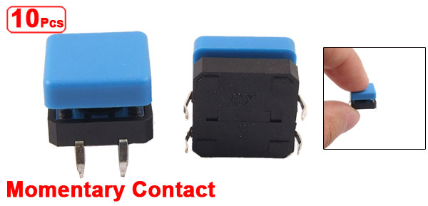 Product Name Tact Switch Contact Type Momentary Contact Size 12 x 12 x 8mm/0.47" x 0.47" x 0.31" (L*W*H) Button Size 12 x 12mm/0.47" x 0.47" (L*W) Pin Pitch 12.5 x 4.5mm/0.49'' x 0.18'' (L*W) Pin Length 4.5mm/0.18'' Material Plastic, Metal, Electric Parts Color Black, Blue Net Weight 12g Package Content 10 x Tact Switches - Reviews