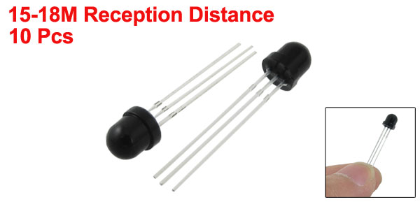 Product Name Infrared Remote Control Receiver Module Model Number PIC-0038N Supply Voltage 2.7V-5.5V Reception Distance 15-18M Body Size 5.8 x 6.3mm / 0.23" x 0.25"(Dia.*H) Pin Length 22.8mm / 0.9" Pin Pitch 1.27mm / 0.05" Operating Temperature -30°C to +85°C Material Plastic, Alloy Weight 3g Package Content 10 Pcs x Infrared Remote Control Receiver Modules - Reviews