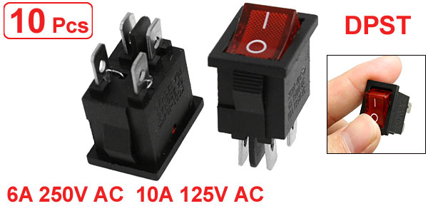 Product Name Rocker Switch Poles DPST Terminals 4 Pin (On - Off) Rating Voltage 6A 250V AC 10A 125V AC Total Size(Each One) 21 x 15 x 29mm / 0.83" x 0.59" x 1.14"(L * W * T) Fixing Hole Size 18 x 12.5 x 23mm / 0.71" x 0.5" x 0.9"(L * W * H) Color Black,Red Material Plastic & Metal Total Weight 44g Package Content 10 x Rocker Switch - Reviews