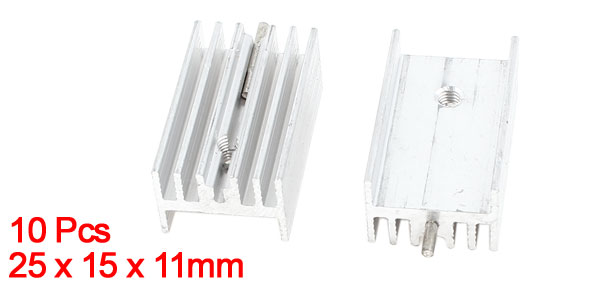 Product Name Heatsink Material Aluminium Fit for TO-220 Transistors Color Silver Tone Mount Hole M3 Screw Hole Overall Size 25 x 15 x 11mm/ 1" x 0.6" x 0.5" (L*W*H) Weight 44g Package Content 10 x Heatsink - Reviews