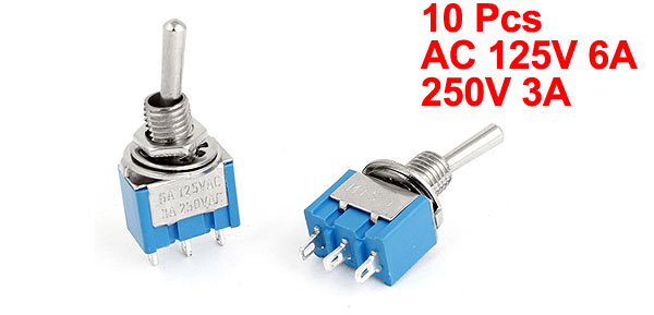 Pin Number 3 Pin Position 3 Position (On/Off/On) Type SPDT(latching) Total Size(Approx.) 32 x 13 x 12mm/ 1.3" x 0.51" x 0.47"(L*W*H) Main Color Blue,Silver Tone Weight 46g Package Content 10 x Toggle Switch - Reviews