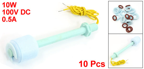 Product Name Floating Switch Model No. ZP10010 Max Contact Rating 10W Max Switching Voltage 100V DC Max Switching Current 0.5A Max Breakdown Voltage 220V DC Max Carry Current 1A Max Contact Resistance 100mΩ Temperature Rating -10 / +85 °C Float Ball Material P.P Float Body Material P.P Thread Dia(Approx) 10mm / 0.39" Thread Length 15mm / 0.59" Switch Length(Thread Excluded) 100mm / 3.9" Cable Length 36cm / 14.2" Color Light Blue Net Weight 184g Package Content 10 x Floating Switch - Reviews