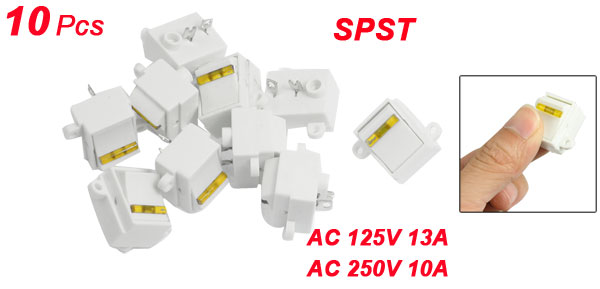 Total Size(Each) 21 x 27 x 21mm/ 0.83" x 1.06" x 0.83"(L*W*H) Mounted Size 20 x 16mm/ 0.79" x 0.63"(L*W) Hole Dia. 2.5mm/ 0.1" Main Color Yellow, White Material Plastic, Metal Weight 43g Package Content 10 x Rocker Switches - Reviews