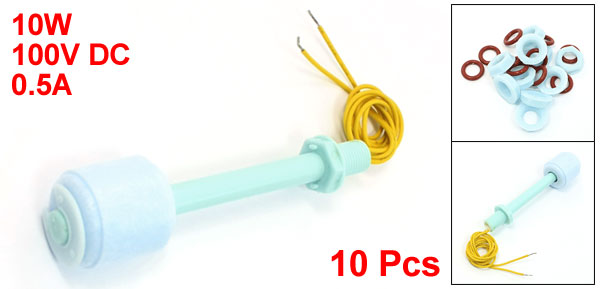 Product Name Floating Switch Model No. ZP8510 Max Contact Rating 10W Max Switching Voltage 100V DC Max Switching Current 0.5A Max Breakdown Voltage 220V DC Max Carry Current 1A Max Contact Resistance 100mΩ Temperature Rating -10 / +85 °C Float Ball Material P.P Float Body Material P.P Thread Dia(Approx) 10mm / 0.39" Thread Length 15mm / 0.59" Switch Length(Thread Excluded) 85mm / 3.4" Cable Length 36cm / 14.2" Color Light Blue Net Weight 76g Package Content 10 x Floating Switch - Reviews