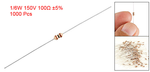 Product Name Carbon Film Resistors Rating Power 1/6W Resistance 100 Ohm Resistance Tolerance ± 5% Withstand Voltage 150V Size(Not Include Leads) 0.18 x 0.35cm / 0.07" x 0.14"(D*L) Leads Dia(Approx) 0.03cm / 0.012" Overall Length(Approx) 4.6cm / 1.8" Color As Picture Shown Weight 57g Package Content 1000(±2%) Pcs of Carbon Film Resistors  - Reviews