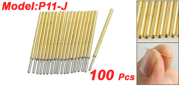 Product Name Spring Probes Quantity 100±2% Pcs Model P11-J Material Metal Tip Diameter (Approx) 0.9mm/ 0.035" Barrel Diameter (Approx.) 1mm/ 0.039" Overall Length(Each) 23mm / 0.905" Color Gold Tone Net Weigth 9g Package Content 100 ±2% x Spring Probes - Reviews