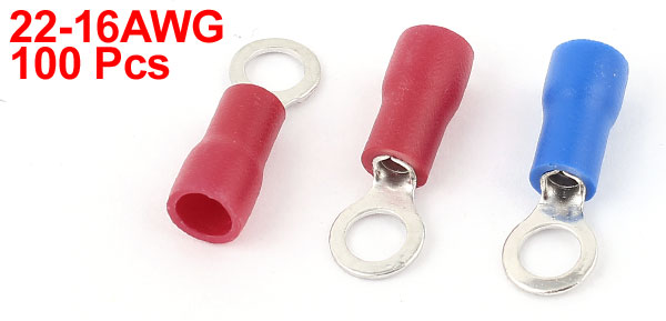 100 Pcs 1.25-4S 22-16AWG Wire Connector Ring Crimp Terminal Red Blue