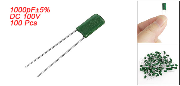 Product Name Polyester Film Capacitors Quantity 100±2% Pcs Model 2A102J Withstand Voltage DC 100V Capacitance 1000pF Capacitance Tolerance ±5% Lead Spacing 3.5mm / 0.138" Lead Diameter 0.4mm / 0.015" Total Size (Approx.) 31 x 5 x 2.5mm / 1.2" x 0.19" x 0.1"(L* W * T) Weight 25g Main Color As Picture Shown Package Content 100 Pcs x Polyester Film Capacitors - Reviews