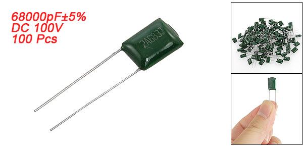 Product Name Polyester Film Capacitors Quantity 100±2% Pcs Model 2A683J Withstand Voltage DC 100V Capacitance 68000pF Capacitance Tolerance ±5% Lead Spacing 6mm / 0.24" Lead Diameter 0.4mm / 0.015" Total Size (Approx.) 34 x 8 x 4mm / 1.34" x 0.31" x 0.16"(L* W * T) Weight 58g Main Color As Picture Shown Package Content 100 Pcs x Polyester Film Capacitors - Reviews