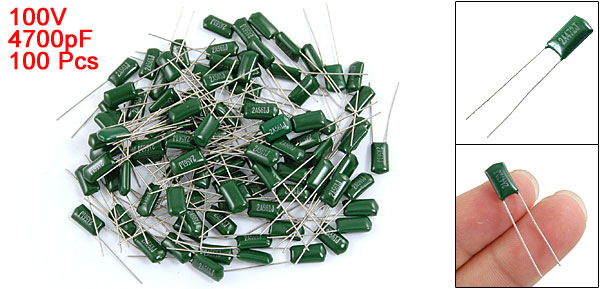 Product Name Polyester Film Capacitors Model 2A472J Rated Voltage 100V Capacitance 4700pF Capacitance Tolerance ±5% Lead Spacing 4mm / 0.1" Lead Diameter 0.4mm / 0.015" Total Size (Approx.) 30 x 5 x 1.5mm / 1.1" x 0.19" x 0.059"(L* W * T) Weight 25g Main Color As Picture Shown Package Content 100 Pcs(±2%) x Polyester Film Capacitors - Reviews