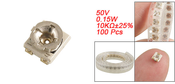 Details100 Pcs 10K Ohm SMD 1/8" Square Trimmer Potentiometer  Product Name Potentiometer Quantity 100±2% Pcs Withstand Voltage 50V Rated Power 0.15W Resistance Value 10kΩ (10, 000ohm) Tolerance ±25% Mounting Type SMT Turn Number Single Turn Resistance Change Type Linear Resistive Material Carbon Film Square Body Size 3 x 3mm/ 1/8" x 1/8" (L*W) Color As Picture Shown Weight 7g Package Content 100 x Potentiometer