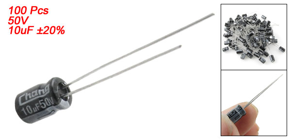Product Name Aluminum Electrolytic Capacitor Type Radial Lead Maximum Temperature 105°C Voltage 50V Capacitance 10uF Capacitance Tolerance ±20% Body Size 5 x 7mm/0.2'' x 0.28'' (D*L) Lead Spacing 2mm/0.08'' Lead Length 25mm/1'', 20mm/ 0.79'' External Material Aluminum Weight 31g Color As Picture Shown Package Content 100 Pcs (±2%) x Electrolytic Capacitors - Reviews