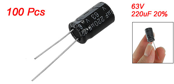 Product Name Aluminum Electrolytic Capacitor Quantity 100±2% Pcs Type Radial Lead Maximum Temperature 105°C Withstand Voltage 63V Capacitance 220µF Capacitance Tolerance ±20% Body Size 10 x 17mm/ 0.39'' x 0.67" (D*L) Lead Spacing 5mm/ 0.2'' Lead Length 26mm/ 1.02'', 22mm / 0.87'' External Material Aluminum Weigh 172g