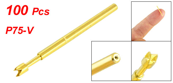 Product Name Spring Probes Quantity 100±2% Pcs Model P75-V Material Metal Tip Diameter (Approx) 1.3mm/ 0.051" Barrel Diameter (Approx.) 1.02mm/ 0.04" Overall Length(Each) 16.50mm / 0.65" Color Gold Tone Net Weigth 8g Package Content 100 x Spring Probes - Reviews