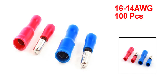 100 Pcs 16-14AWG 15A Red Blue Full Insulated Bullet Crimp Terminal Connector