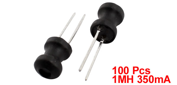Product Name Radial Inductor Inductance 1mH Rating Current 350mA Tolerance 10% Body Size 6 x 8mm / 0.24" x 0.31"(D*H) Pin Size 0.55 x 14mm/ 0.22" x 0.55"(D*L) Lead Distance 2mm / 0.08" Color Black, Silver Tone Weight 83g Package Content 100Pcs(±2%) x Radial Inductor - Reviews