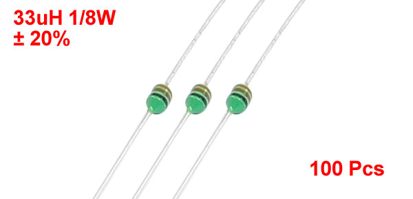 Product Name Fixed Inductor Lead Type Axial Power Rating 1/8W Industance Tolerance ± 20% Industance 33 uH Total Size (Approx) 6 x 0.2cm / 2.4" x 0.08" (L*D) Main Color Green, Silver Tone Weight 12g Package Content 100(+/-2%) Pcs x Fixed Inductor - Reviews