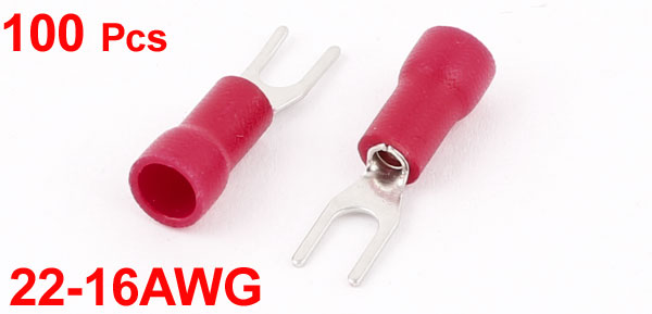 Details100 Pcs 22-16AWG Red Pre Insulated Electrical Fork Terminal Cable Connector  Product Name Fork Terminal Model SV1.25-3 Fit Cable Size 0.5-1.5mm2 (22-16AWG) Hole Dia 4mm/0.16" Fork Spacing 4mm/0.16" Total Length 20mm/ 0.8'' Material PVC Plastic, Metal Color Red Weight 37g Package Content 100 Pcs (±2%) x Fork Terminal