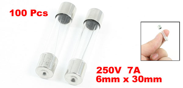 Product Name Glass Tube Fuses Quantity 100±2% Pcs Features Fast Blow(F) Low Breaking Capacity(L) Rated Voltage 250V Rated Current 7A Total Size 6 x 30mm/ 0.24" x 1.2" (D*L) Material Glass, Metal Color Silver Tone, Clear Weight 118g Package 100 x Glass Tube Fuses - Reviews