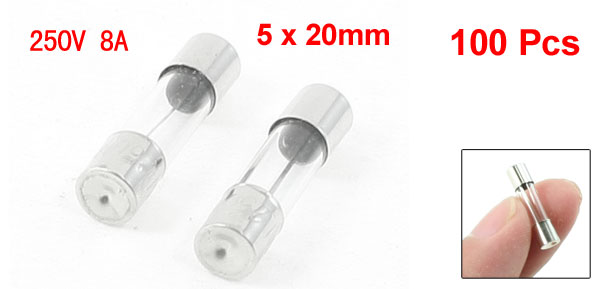 100 Pcs 250 Volts 8Amp Fast Blow Type Glass Tube Fuses 5 x 20mm