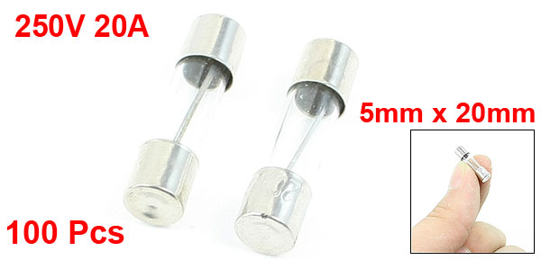 Product Name Glass Tube Fuses Quantity 100±2% Pcs Features Fast Blow(F) Low Breaking Capacity(L) Rated Voltage 250V Rated Current 20A Dimension 5 x 20mm/ 0.2" x 0.8" (D*L) Material Glass Color Clear, Silver Tone Weight 56g Package 100 x Glass Tube Fuses - Reviews