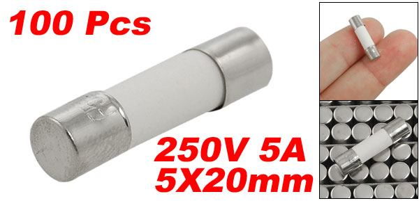 Product Name Ceramic Fuse Fuse Type Fast Acting Features Low Breaking Capacity Rated Voltage 250V Rated Current 5A Specification 5 x 20mm Diameter 5mm / 0.196" Length 20mm / 0.787" Quantity 100(±2%) Material Ceramic Main Color White, Silver Tone Net Weight 89g Package Content 100 x Ceramic Fuses - Reviews
