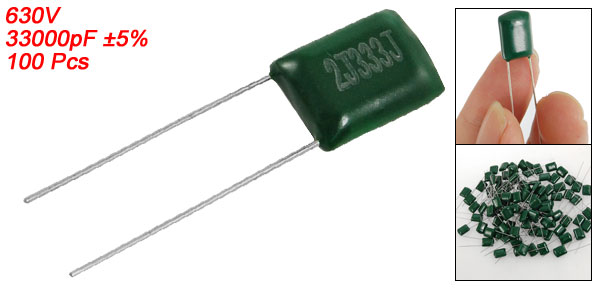 Product Name Polyester Film Capacitors Model 2J333J Withstand Voltage 630V DC Capacitance 33000pF Capacitance Tolerance ±5% Lead Spacing 6mm / 0.12" Lead Diameter 0.4mm / 0.015" Total Size (Approx.) 34 x 8.9 x 4.4mm / 1.3" x 0.35" x 0.2"(L* W * T) Quantity 100 Pcs ± 2% Weight 66g Main Color As Picture Shown Package Content 100 Pcs(±2%) x Polyester Film Capacitors - Reviews