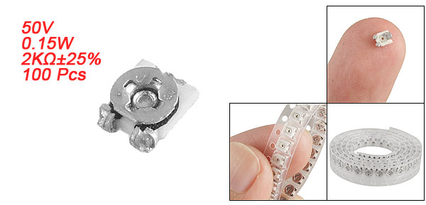 Product Name Potentiometer Quantity 100±2% Pcs Withstand Voltage 50V Rated Power 0.15W Resistance Value 2KΩ (2 000ohm) Tolerance ±25% Mounting Type SMT Turn Number Single Resistance Change Type Linear Resistive Material Carbon Fim Temperature Coefficient ±250ppm/°C Square Body Size 3 x 3mm/ 1/8" x 1/8" (L*W)