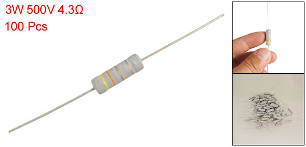 Product Name Metal Oxide Film Resistors Quantity 100±2% Pcs Power Rating 3W Withstand Voltage 500V Resistance 4.3 Ohm Resistance Tolerance ± 5% Total Length(Approx.) 8cm / 3.1" Color As Picture Show Weight 155g Package Content 100 x Metal Oxide Film Resistors - Reviews