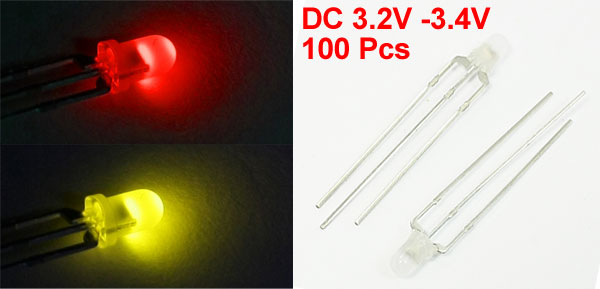100 Pcs 3mm Red Yellow LED 3 Pins Connecting Light Emitting Diodes