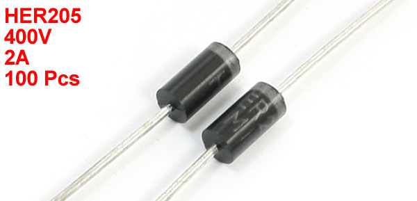 Product Name High Efficiency Rectifier Diodes Model HER205 Max Repetitive Peak Reverse Voltage 400V Average Forward Current 2A Lead Size(Each Side) 0.7 x 26mm/0.08" x 1"(D*L) Body Dimension 3 x 6mm/0.12" x 0.24"(D*L) Color As Picture Shown Weight 30g Package Content 100Pcs(±2%) x High Efficiency Rectifier Diodes - Reviews