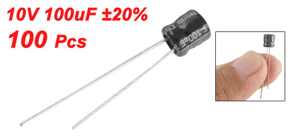 Product Name Aluminum Electrolytic Capacitor Type Radial Lead Maximum Temperature 105°C Withstand Voltage 10V Capacitance 100uF Capacitance Tolerance ±20% Body Size 5 x 5mm / 0.2'' x 0.2'' (D*L) Lead Spacing 2mm / 0.08'' Lead Length 25mm / 0.98'', 19mm / 0.75'' External Material Aluminum Weight 17g Color As Picture Shown Package Content 100 Pcs (±2%) x Electrolytic Capacitors - Reviews