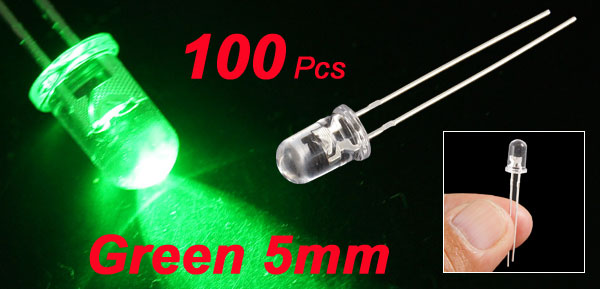 Product Name Light Emitting Diodes Emitting Light Color Green Forward Voltage DC 3.0V -3.2V Luminous Intensity 4000-6000 MCD Wavelength 520-525 nm Head Dia(Approx) 5mm / 0.197" Terminal Center Distance(Approx) 2.4mm / 0.094" Overall Height (Approx) 36mm / 1.4" Color See the Picture Material Plastic, Metal Weight 35g Package Content 100 Pcs(±2%) of Light Emitting Diodes - Reviews