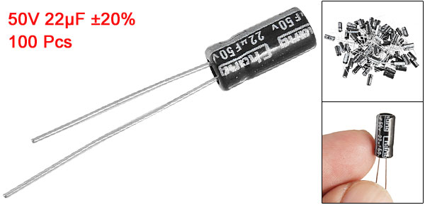 Product Name Aluminum Electrolytic Capacitor Quantity 100±2% Pcs Type Radial Lead Maximum Temperature 105°C Withstand Voltage 50V Capacitance 22µF Capacitance Tolerance ±20% Body Size 5 x 11mm / 0.2" x 0.43" (D*L) Lead Spacing 2.54mm / 0.1'' Lead Length 27mm / 1.06'', 21mm / 0.83'' External Material Aluminum Weight 44g