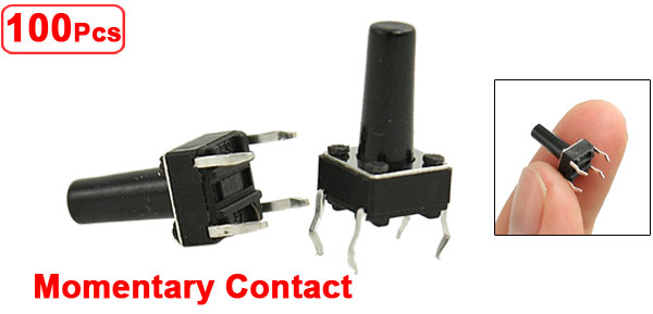 Product Name Tact Switch Quantity 100±2% Pcs Contact Type Momentary Contact Dimension 6 x 6 x 12mm / 0.24" x 0.24" x 0.47" (L*W*H) Button Dia. 3mm/ 0.12" Pin Pitch 5 x 6mm / 0.2" x 0.24" (L*W) Pin Length 5mm / 0.2" Material Plastic, Metal, Electric Parts Color Black, Silver Tone Net Weight 35g Package Content 100 x Tact Switches - Reviews