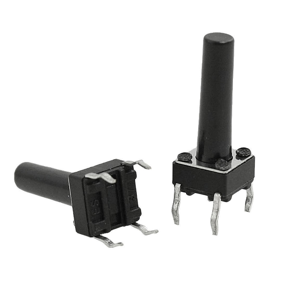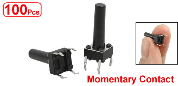 Product Name Tact Switch Quantity 100±2% Pcs Contact Type Momentary Contact Dimension 6 x 6 x 16mm / 0.24" x 0.24" x 0.63" (L*W*H) Button Dia. 3mm/ 0.12" Pin Pitch 5 x 6mm / 0.2" x 0.24" (L*W) Pin Length 5mm / 0.2" Material Plastic, Metal, Electric Parts Color Black, Silver Tone Net Weight 37g Package Content 100 x Tact Switches - Reviews