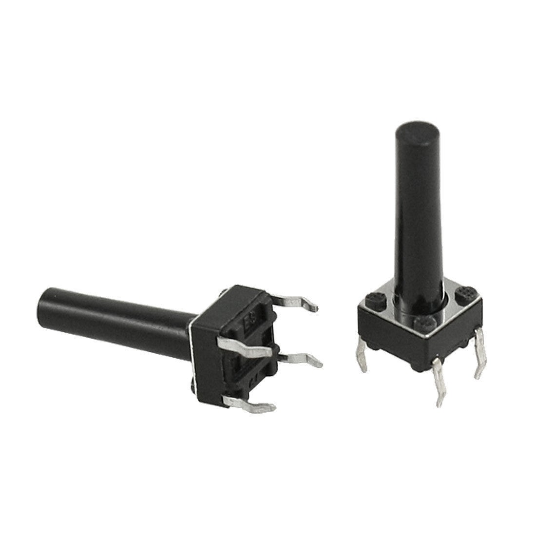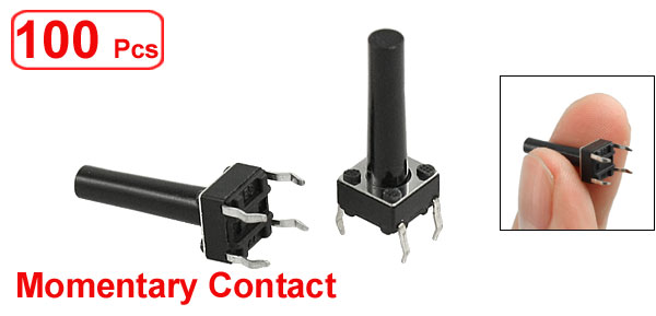 Product Name Tact Switch Quantity 100±2% Pcs Contact Type Momentary Contact Dimension 6 x 6 x 17mm / 0.24" x 0.24" x 0.67" (L*W*H) Button Dia. 3mm/ 0.12" Pin Pitch 5 x 6mm / 0.2" x 0.24" (L*W) Pin Length 5mm / 0.2" Material Plastic, Metal, Electric Parts Color Black, Silver Tone Net Weight 39g Package Content 100 x Tact Switches - Reviews
