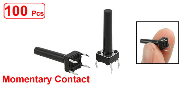 Product Name Tact Switch Quantity 100±2% Pcs Contact Type Momentary Contact Dimension 6 x 6 x 20mm / 0.24" x 0.24" x 0.79" (L*W*H) Button Dia. 3mm/ 0.12" Pin Pitch 5 x 6mm / 0.2" x 0.24" (L*W) Pin Length 5mm / 0.2" Material Plastic, Metal, Electric Parts Color Black, Silver Tone Net Weight 42g Package Content 100 x Tact Switches - Reviews