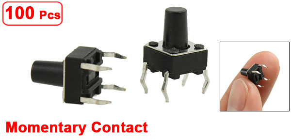 Product Name Tact Switch Quantity 100±2% Pcs Contact Type Momentary Contact Dimension 6 x 6 x 8.5mm / 0.24" x 0.24" x 0.33" (L*W*H) Button Dia. 3mm/ 0.12" Pin Pitch 5 x 6mm / 0.2" x 0.24" (L*W) Pin Length 5mm / 0.2" Material Plastic, Metal, Electric Parts Color Black, Silver Tone Net Weight 31g Package Content 100 x Tact Switches - Reviews