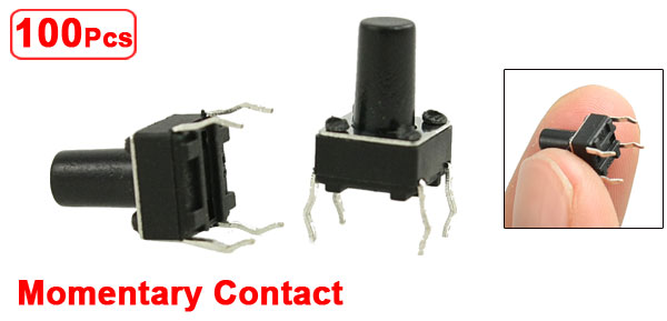 Product Name Tact Switch Quantity 100±2% Pcs Contact Type Momentary Contact Dimension 6 x 6 x 9.5mm / 0.24" x 0.24" x 0.37" (L*W*H) Button Dia. 3mm/ 0.12" Pin Pitch 5 x 6mm / 0.2" x 0.24" (L*W) Pin Length 5mm / 0.2" Material Plastic, Metal, Electric Parts Color Black, Silver Tone Net Weight 34g Package Content 100 x Tact Switches - Reviews