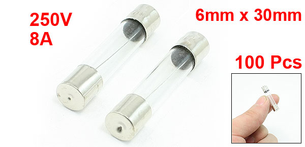 100 Pcs 6mm x 30mm Fast Acting Type Glass Tube Fuses 8A 250V for Security